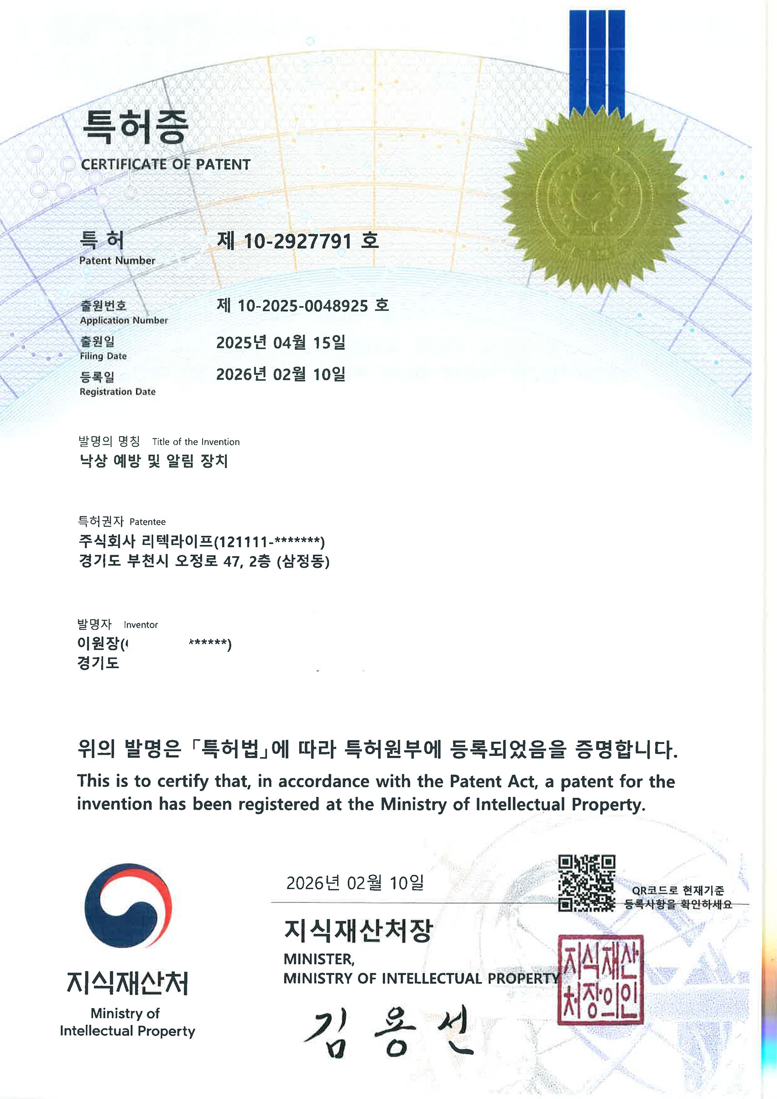 낙상 예방 및 알림 장치 특허증