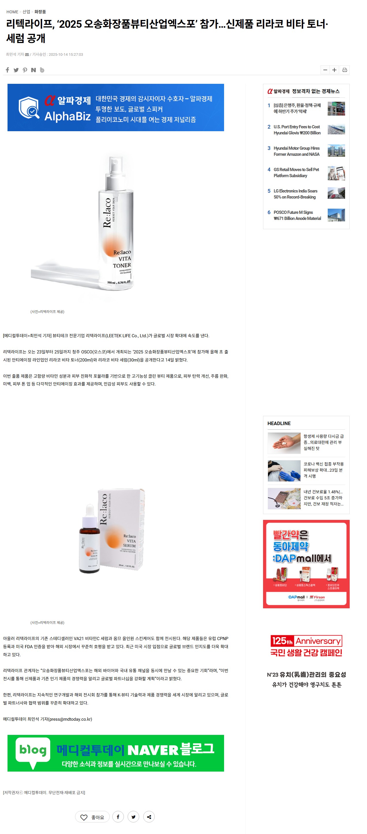 리텍라이프, ‘2025 오송화장품뷰티산업엑스포’ 참가…신제품 리라코 비타 토너·세럼 공개